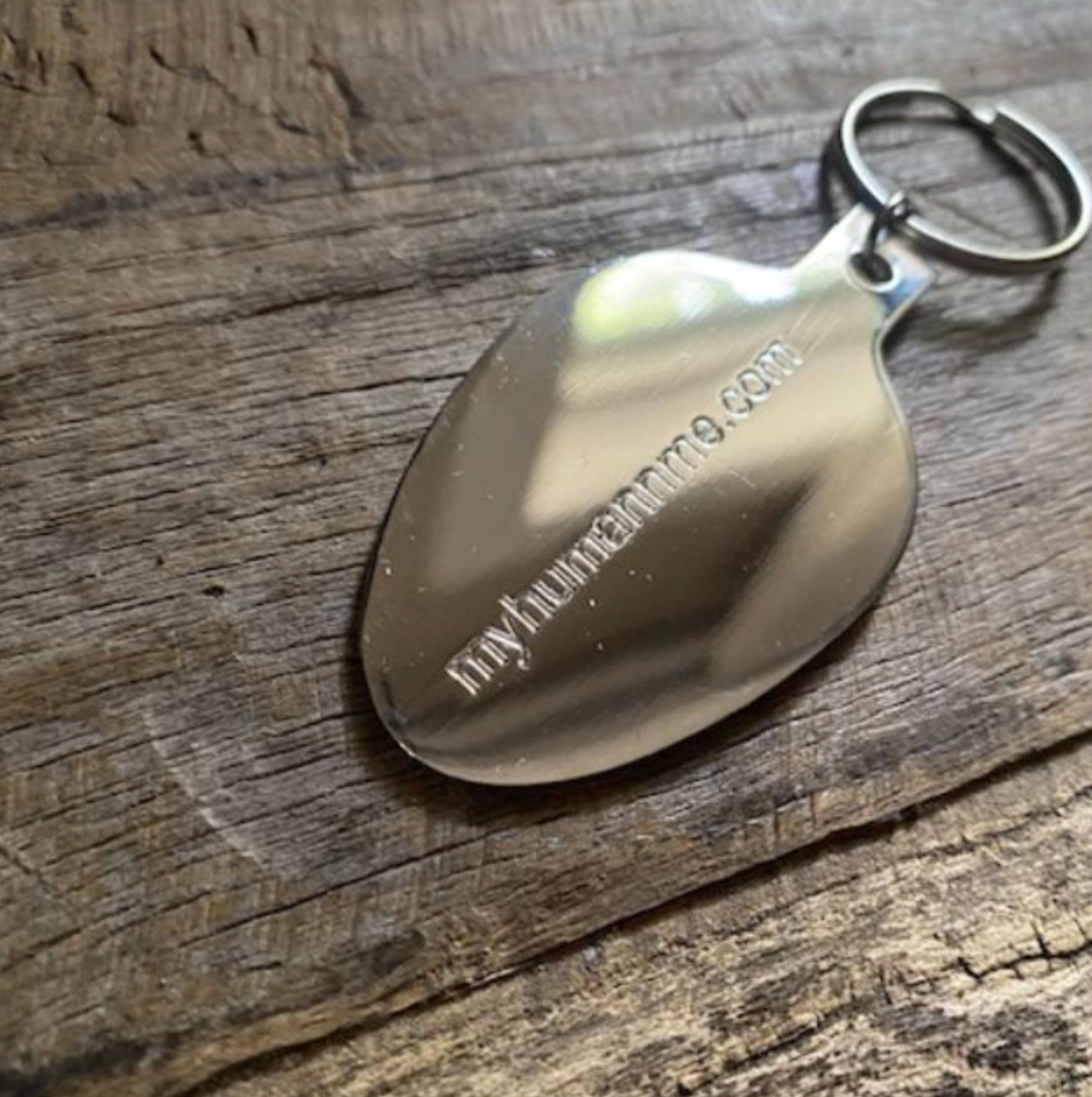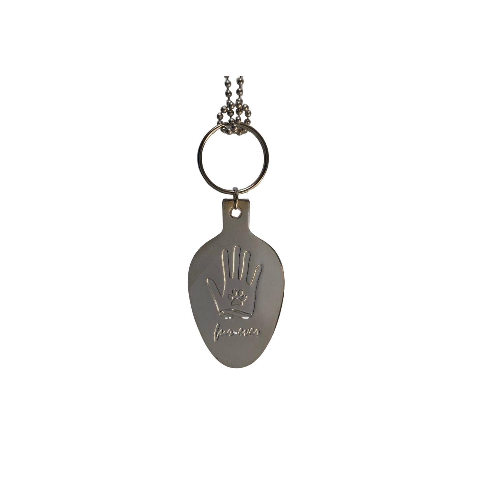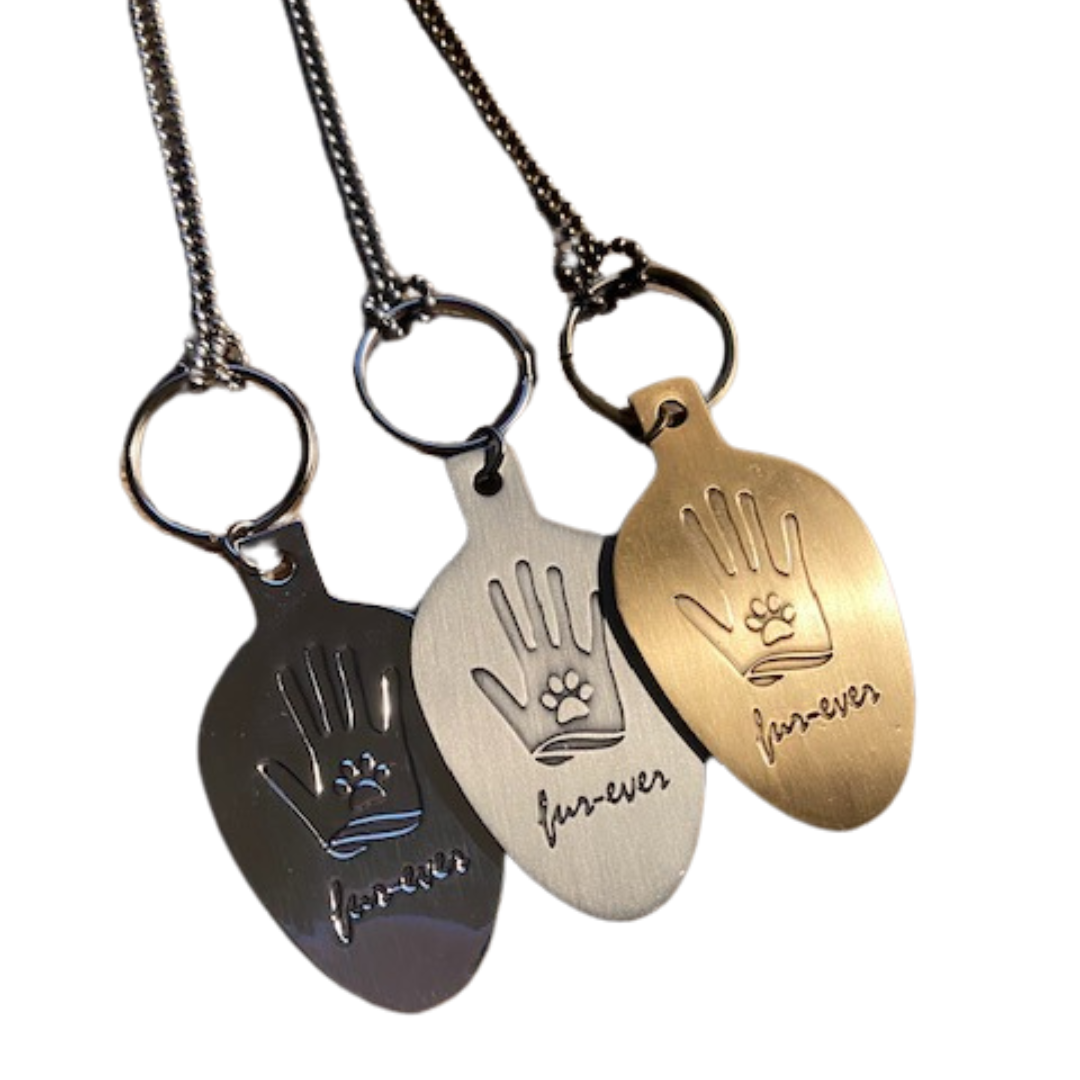 Our keychain features a paw atop a human hand with the words, fur-ever. It is an original design from our parent company, My Human "N" Me, Inc.
